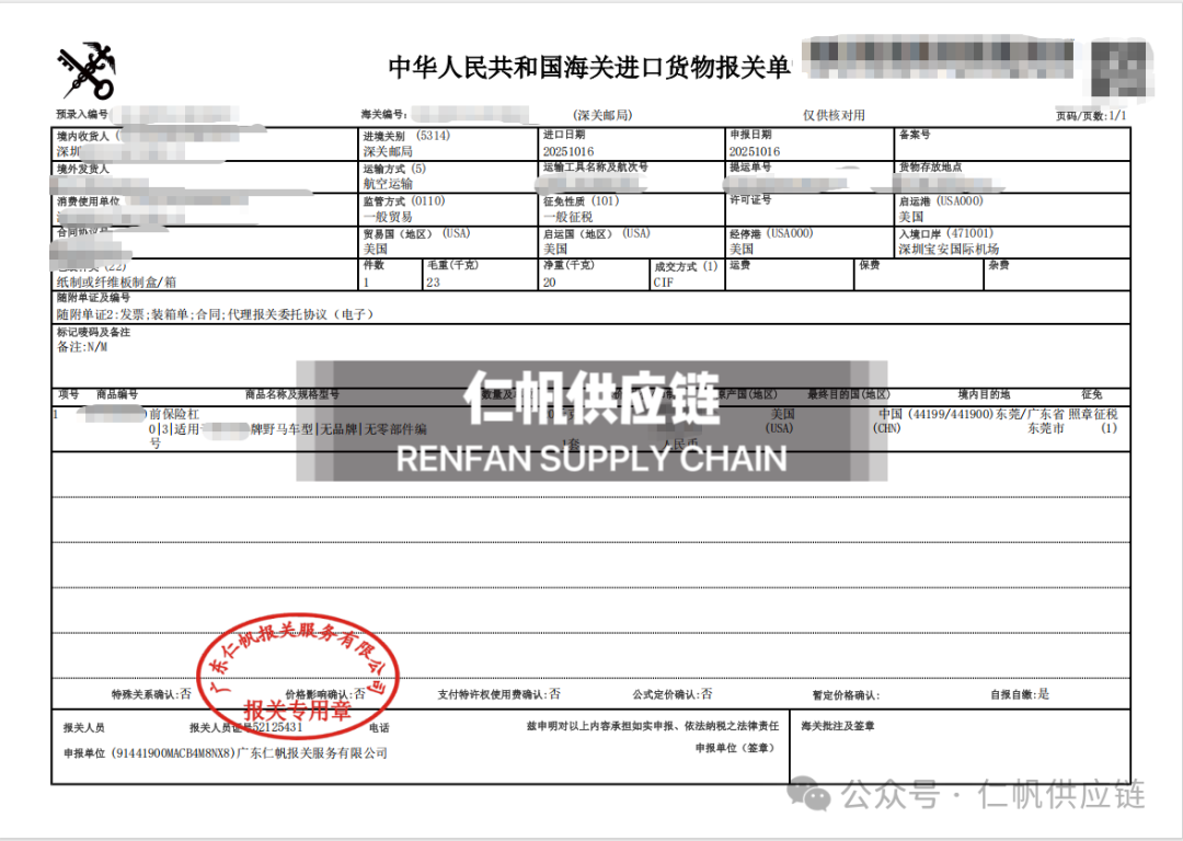 下面仁帆供应链为大家分享一下近期我司近期操作汽车配件进口案例!