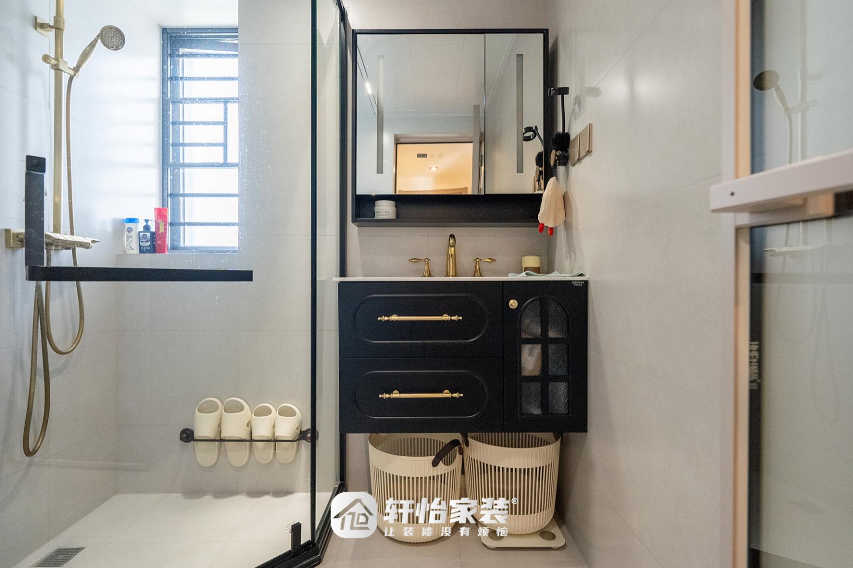 卫生间严格遵循干湿分离设计,提升使用舒适度与便捷性。黑色悬浮式洗手台搭配精致的金色拉手,在细节处彰显复古韵味,易于打理的同时也保证了视觉上的轻盈感。