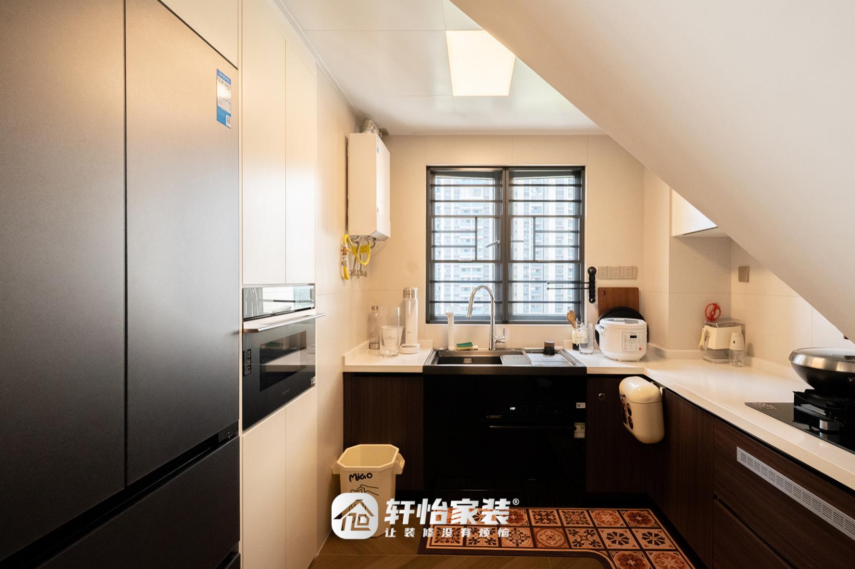 厨房以开放式形态融入公区,U型布局确保了“洗-切-炒”动线流畅高效。橱柜构成简洁的几何色块,在小空间内铺垫出丰富层次。
