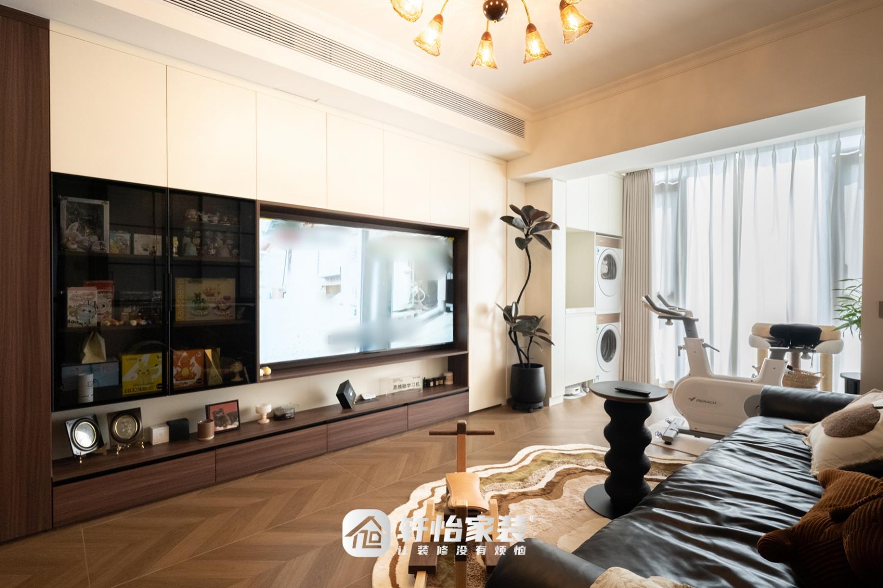 电视背景墙成为视觉焦点,采用深胡桃木与奶白色进行体块对撞,深浅对比间打破了传统矩形构图,兼具收纳功能与艺术美感。