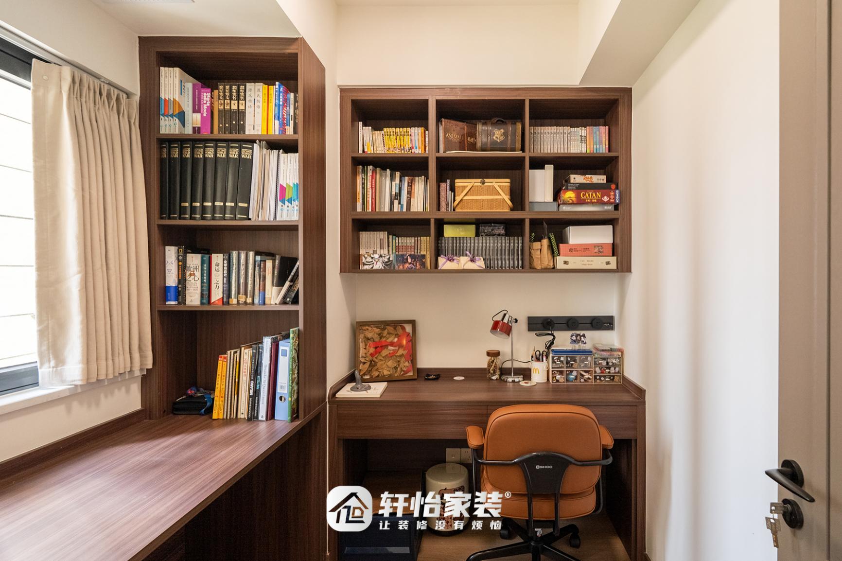 书房虽小,但通过定制胡桃木书桌和书柜,营造出沉稳宁静的办公阅读环境。