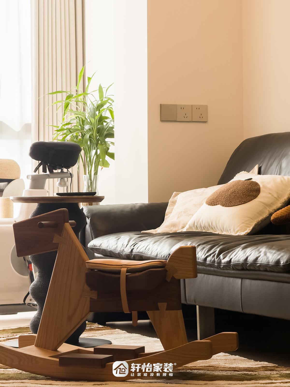 沙发、边几等家具在颜色和材质上层层递进,强化复古气息,而小木马、抱枕等软装则在细节处营造出随性温馨的生活氛围。