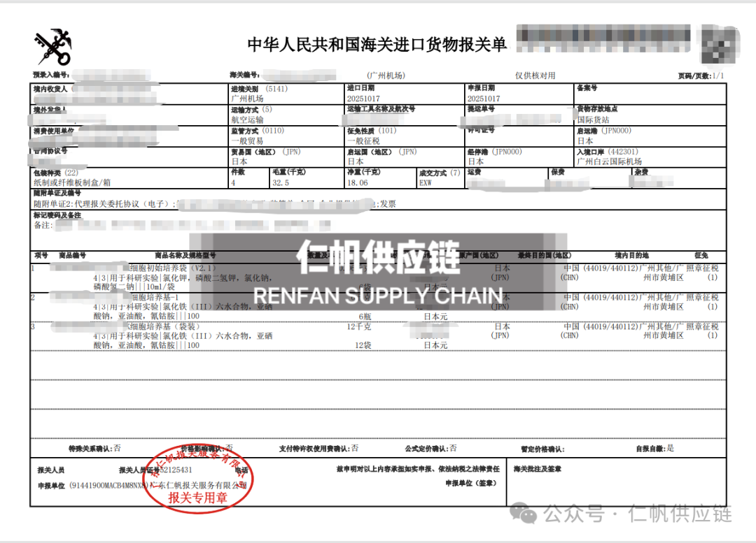 下面仁帆供应链为大家分享一下近期我司近期操作全程冷链生物试剂进口案例!