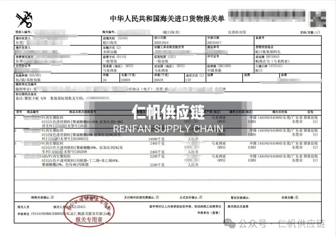 下面仁帆供应链为大家分享一下近期我司近期操作塑胶粒进口案例!