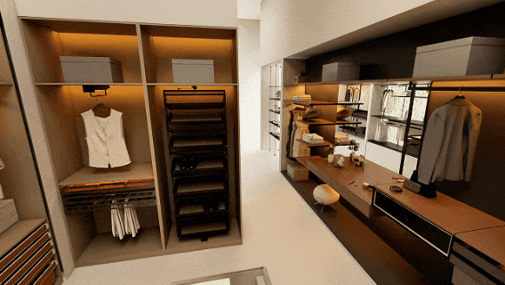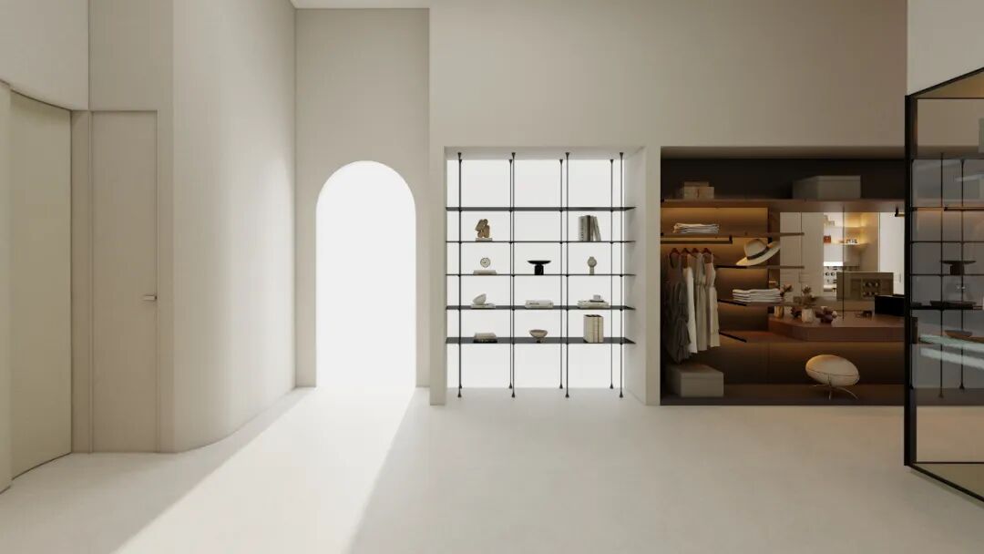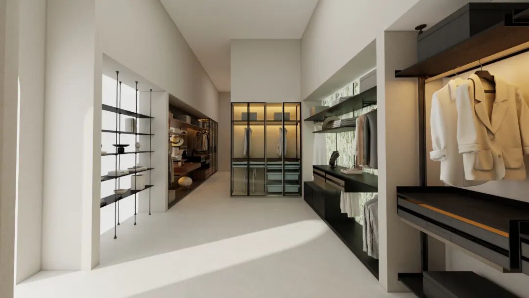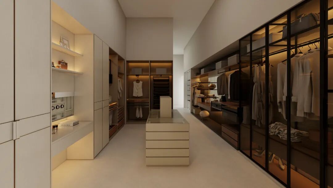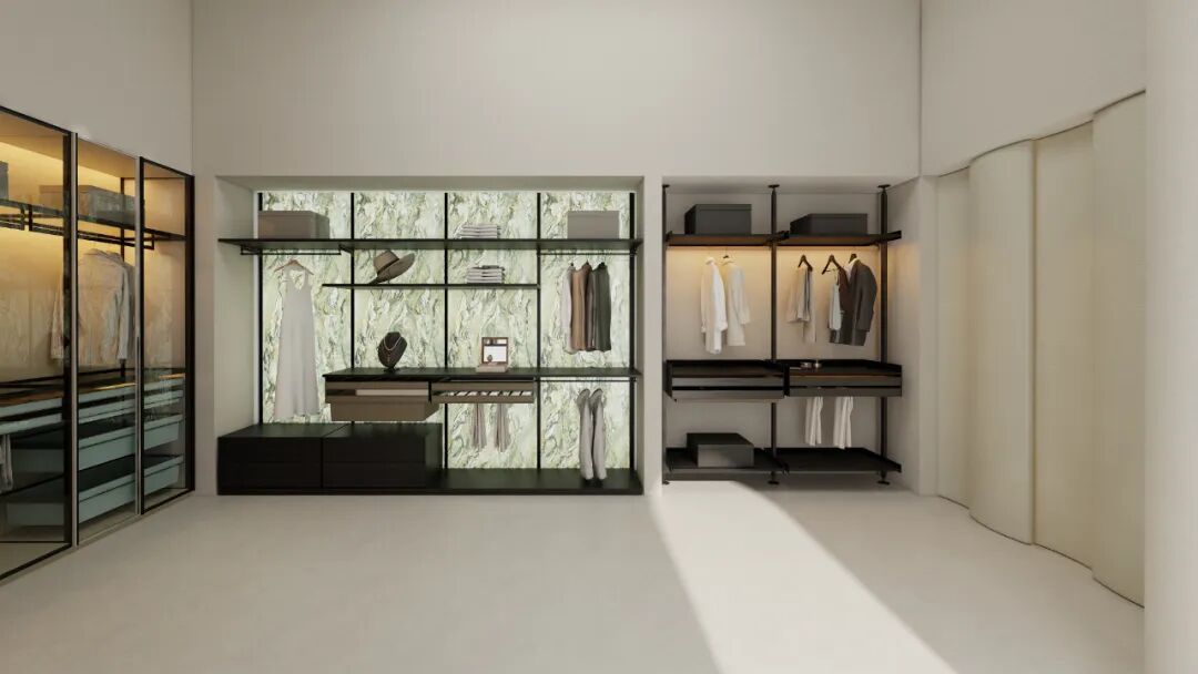 特别设计的"静思角落"通过隐藏式光源和建筑感构图,创造出让人驻足沉思的空间。镜面装饰既扩展了视觉维度,又暗喻对自我风格的审视。每个细节都体现着"收纳即艺术"的品牌哲学,让收纳行为升华为日常生活中的美学仪式。
