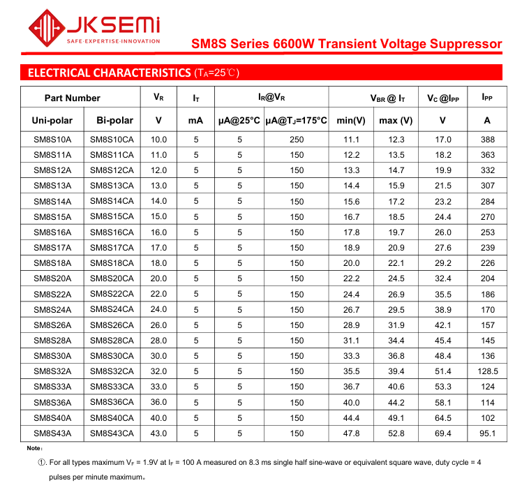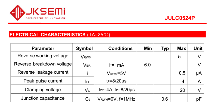 咱就拿金开盛电子的两份规格书(“JKSEMI_TVS_Diode_SM8S_6600W_Datasheet系列”和“ESD-JULC0524P”)当例子,掰开揉碎了讲: